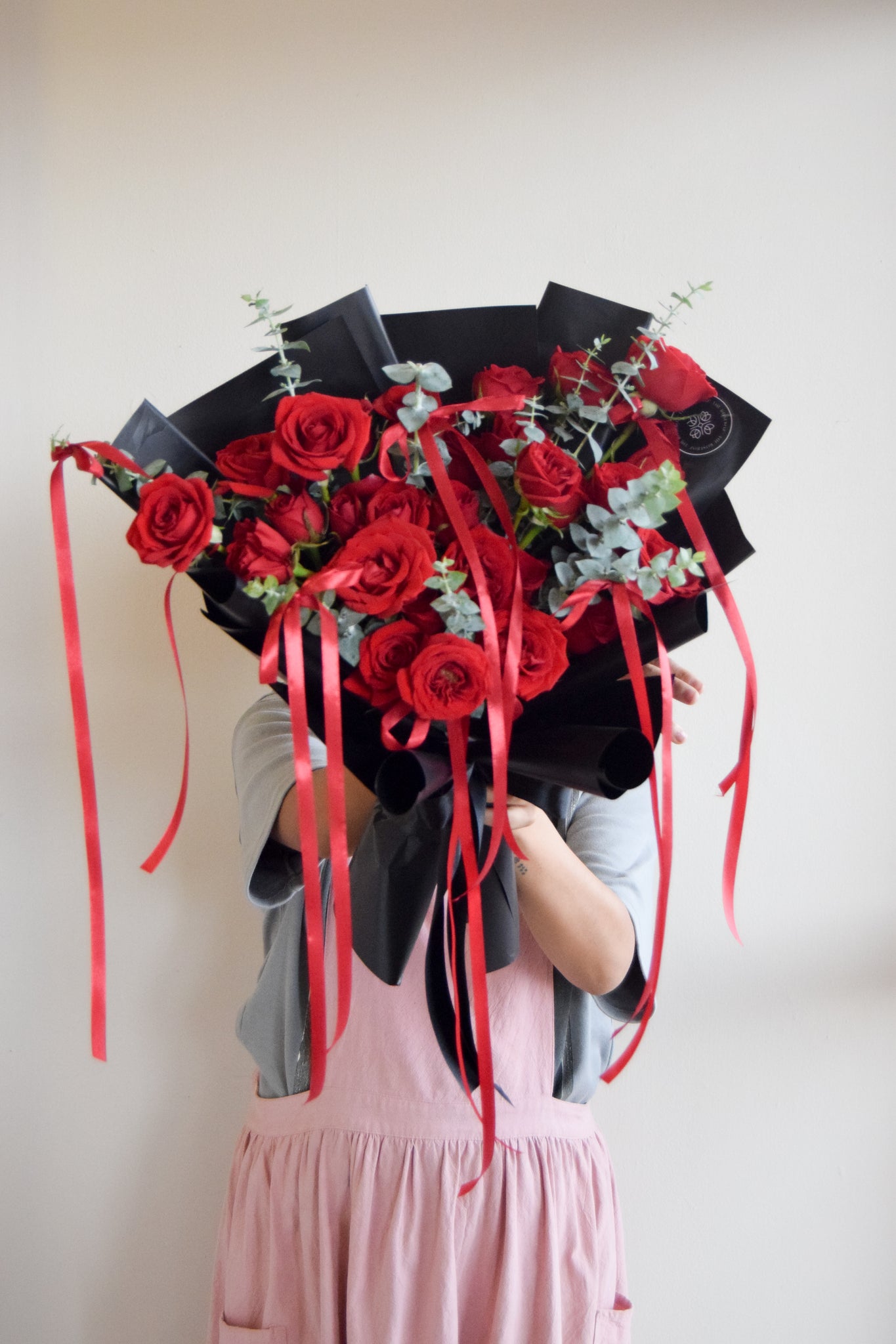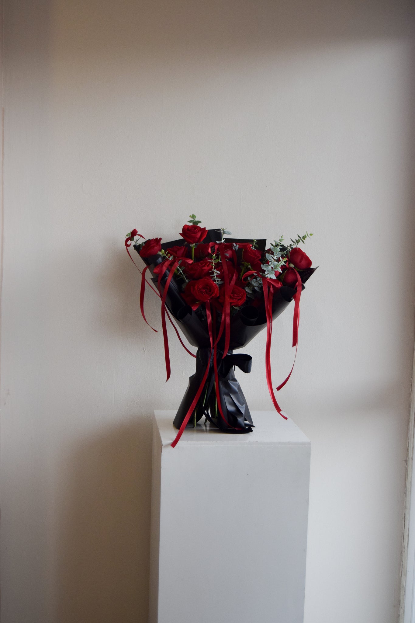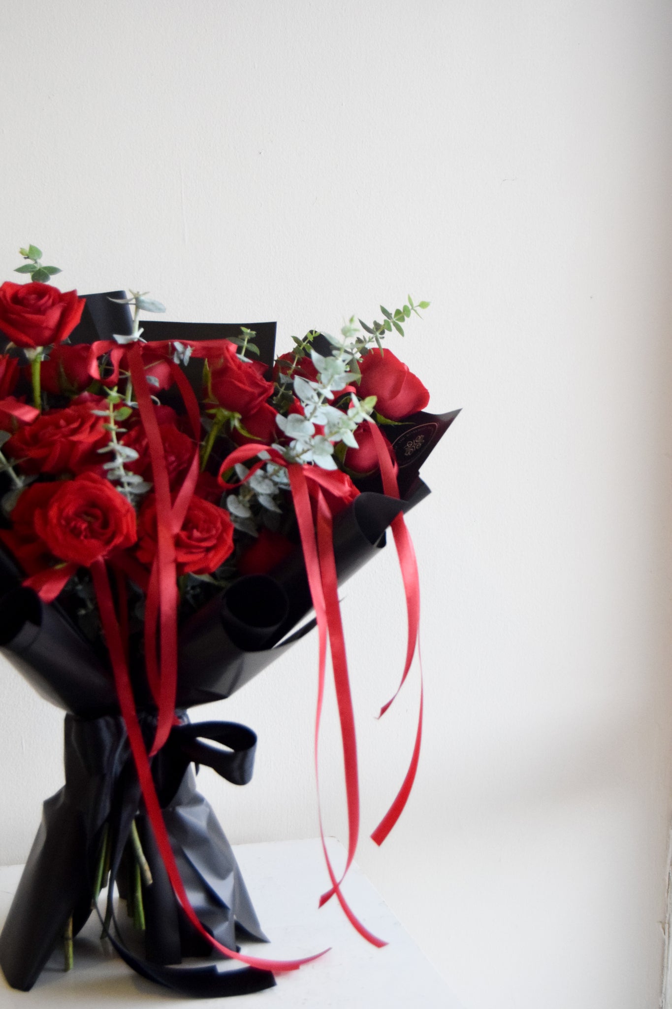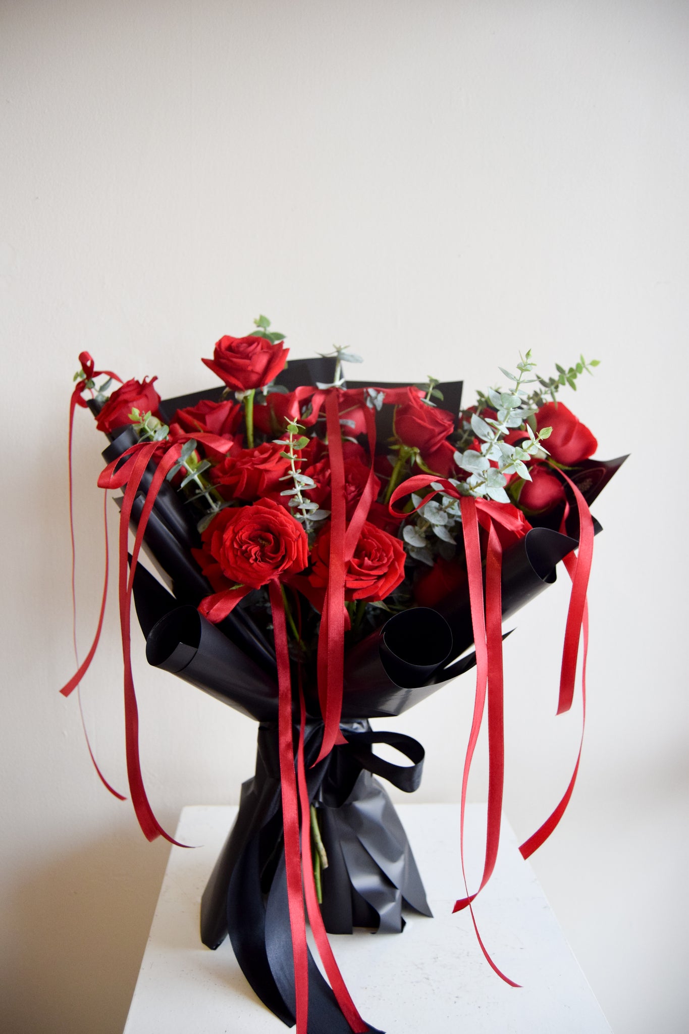 Ramo de rosas rojas con moños de listones que le dan un movimiento único e inolvidable a tus flores.