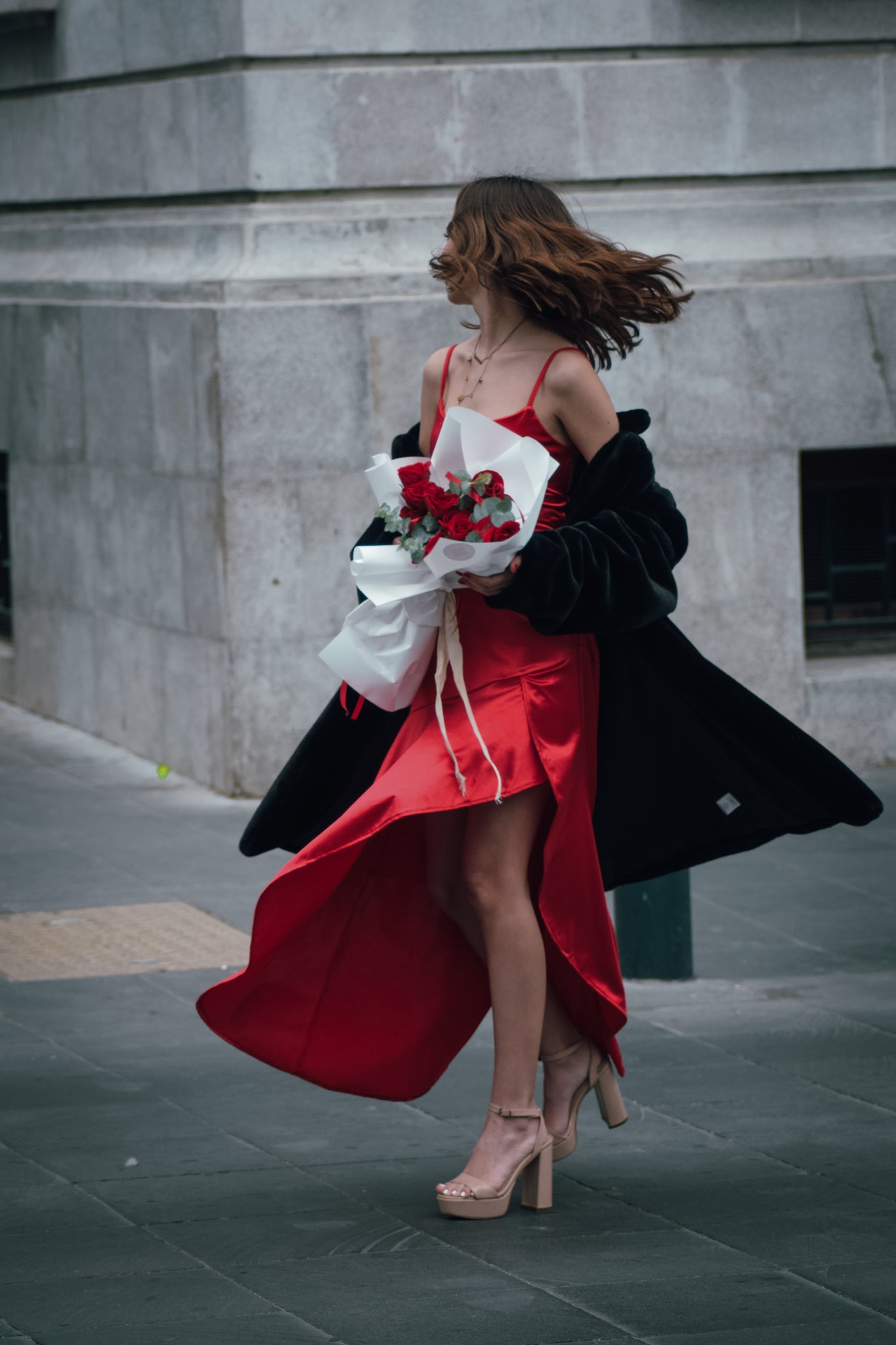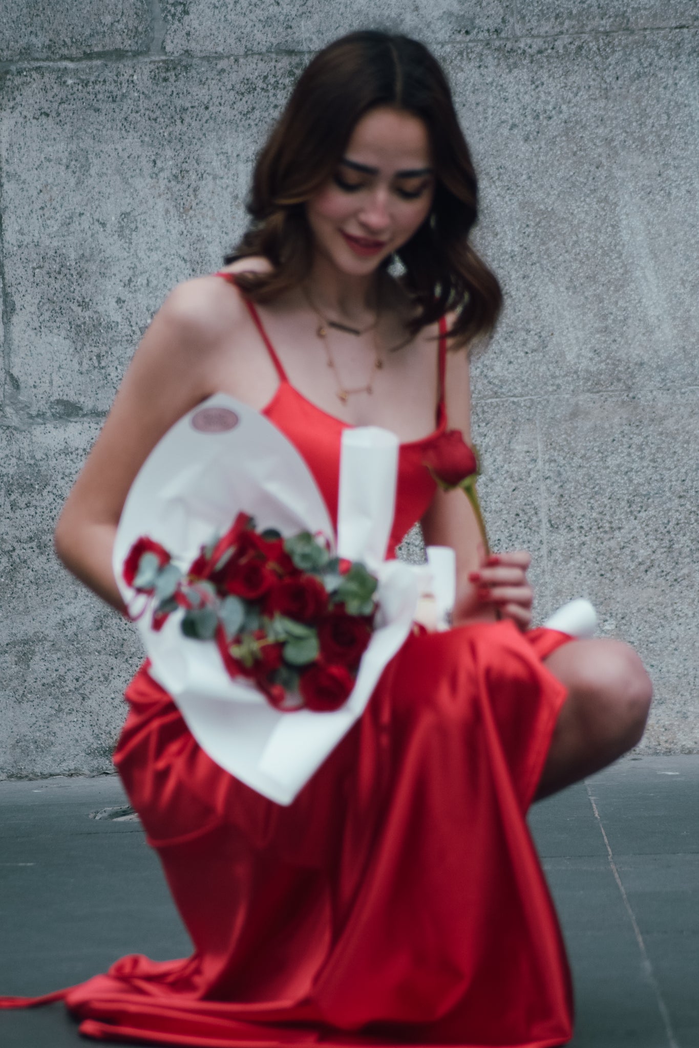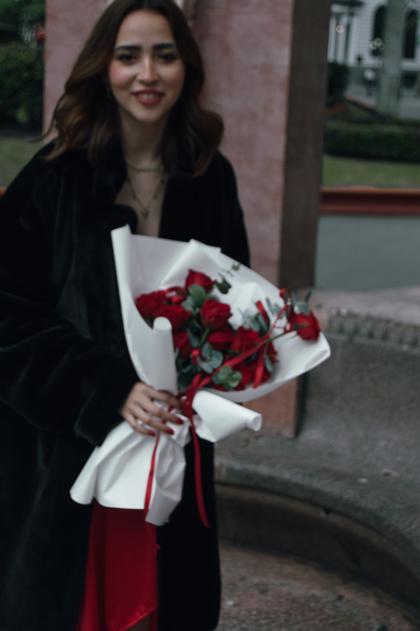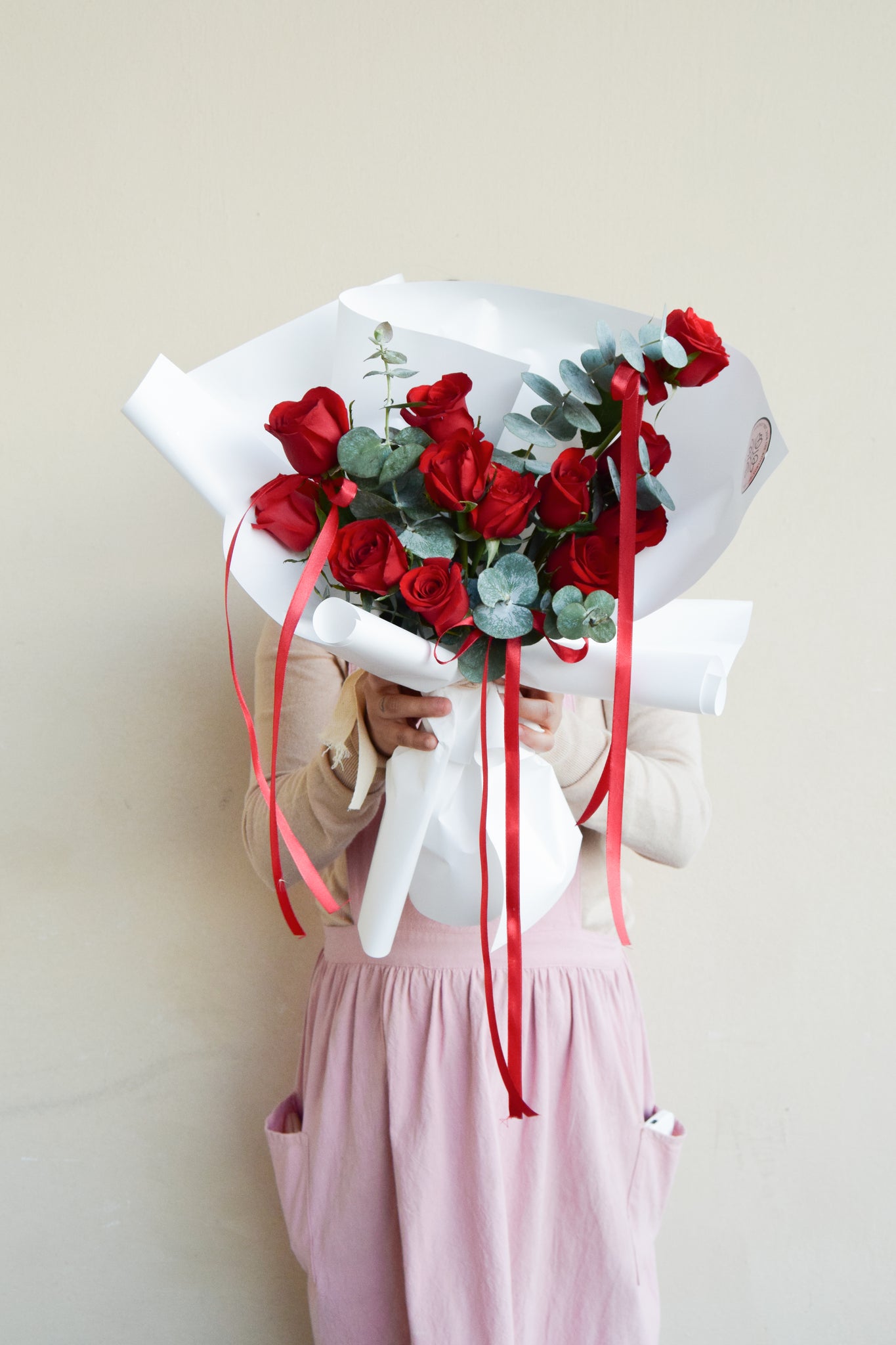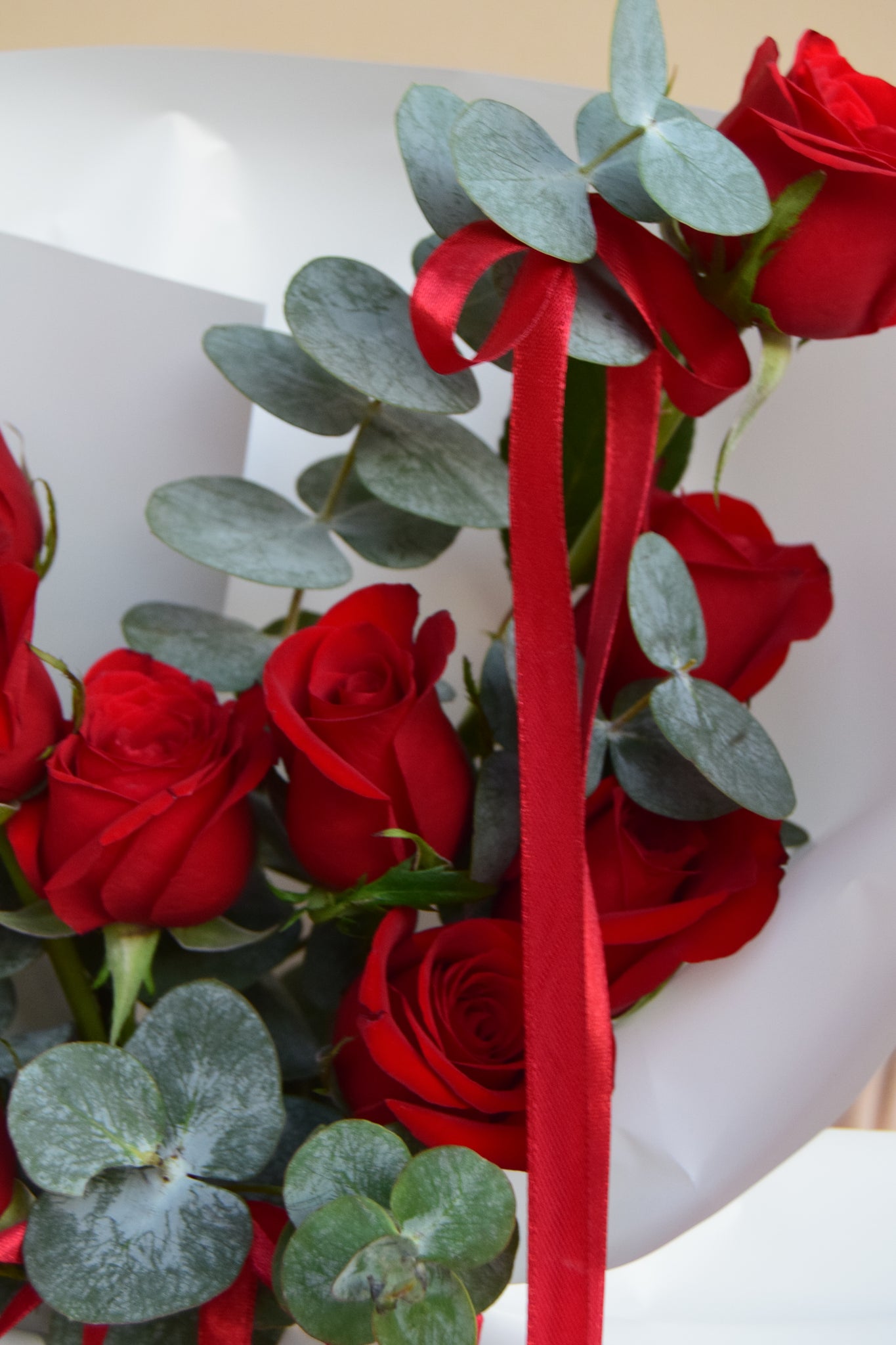 Ramo de rosas rojas con moños de listones que le dan un movimiento único e inolvidable a tus flores.