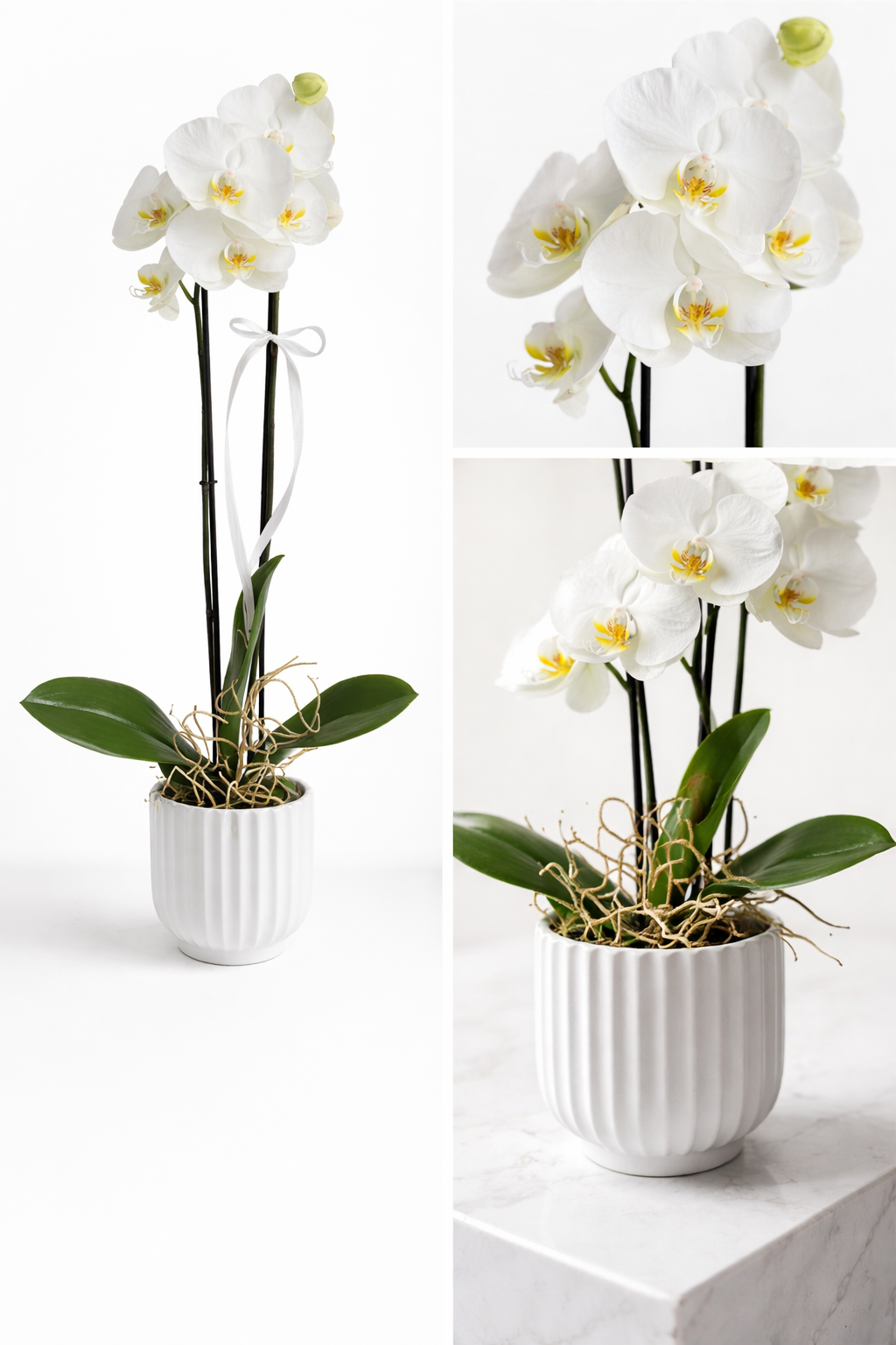 Orquídea elegante en maceta de cerámica, la expresión perfecta de admiración y refinamiento. Cada ejemplar presenta tonalidades únicas que pueden variar respecto a la imagen, garantizando que tu regalo sea verdaderamente exclusivo.