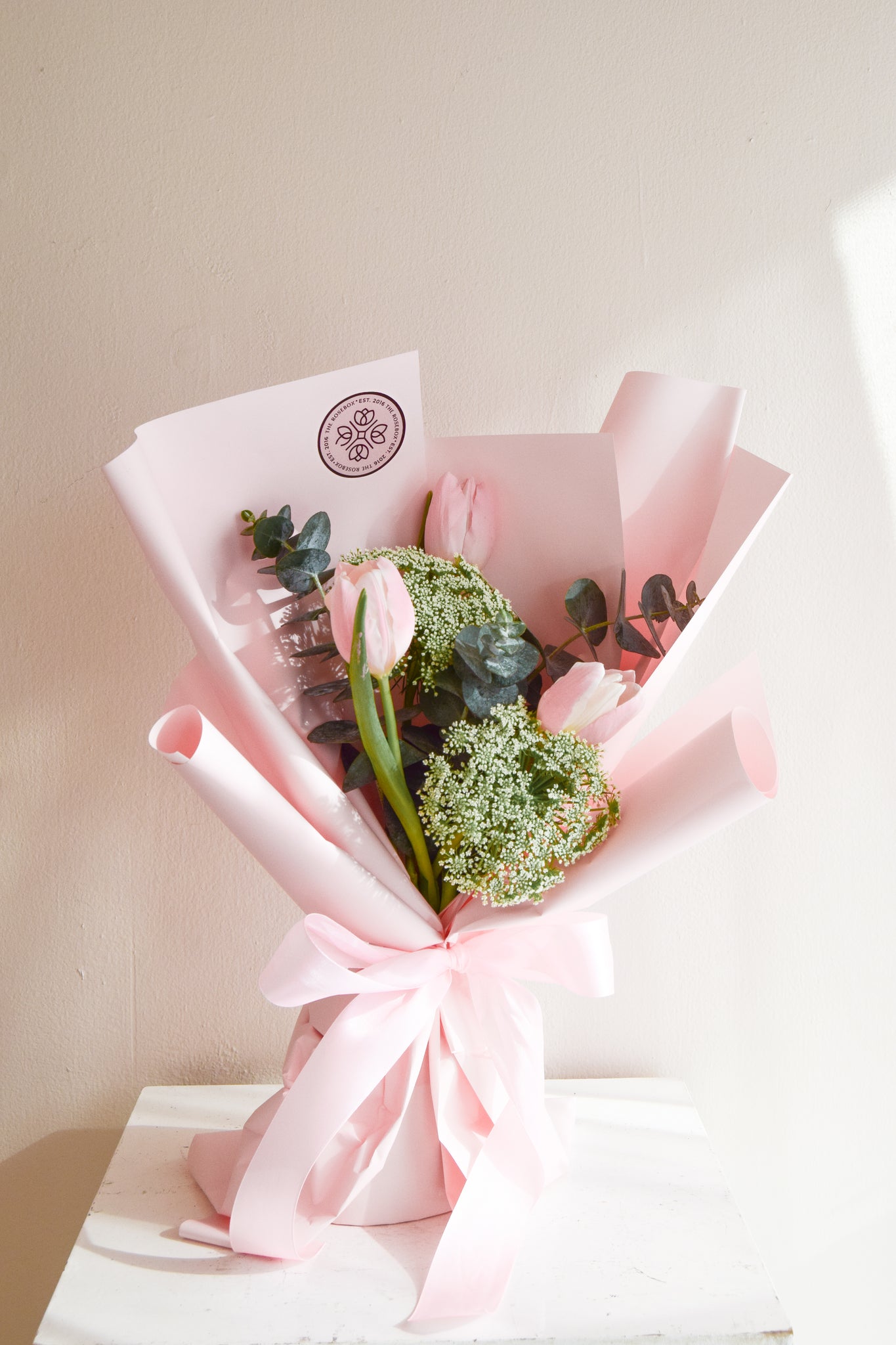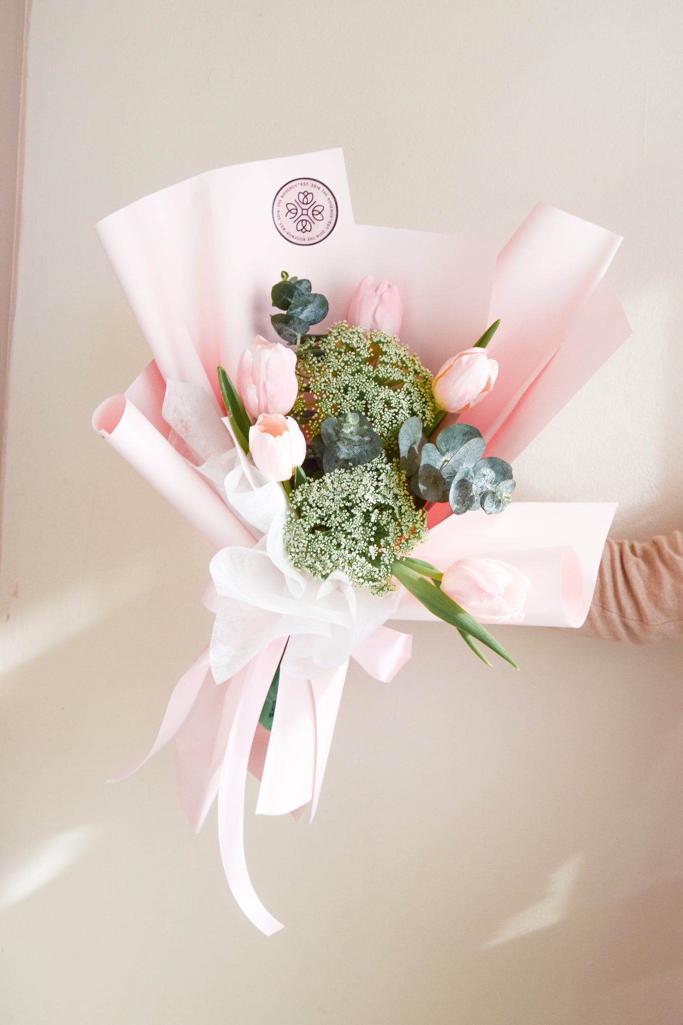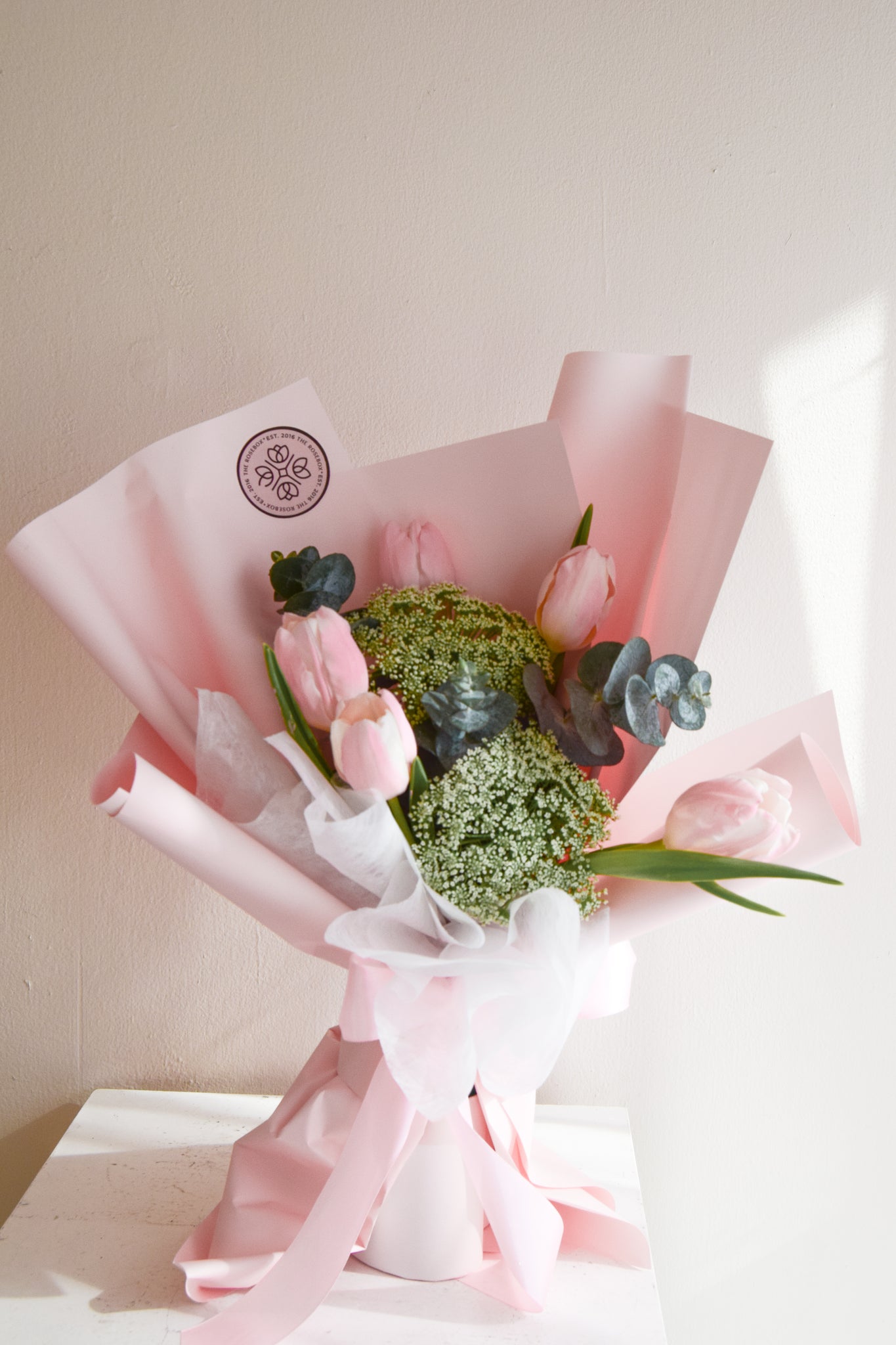 Tulipanes frescos envueltos con elegancia en estilo coreano, perfectos para expresar sofisticación y delicadeza. Cada ramo combina flores premium con follajes cuidadosamente seleccionados, creando una composición refinada que captura la esencia del diseño floral contemporáneo. Ideal para quien aprecia los detalles y busca un regalo que refleje buen gusto.